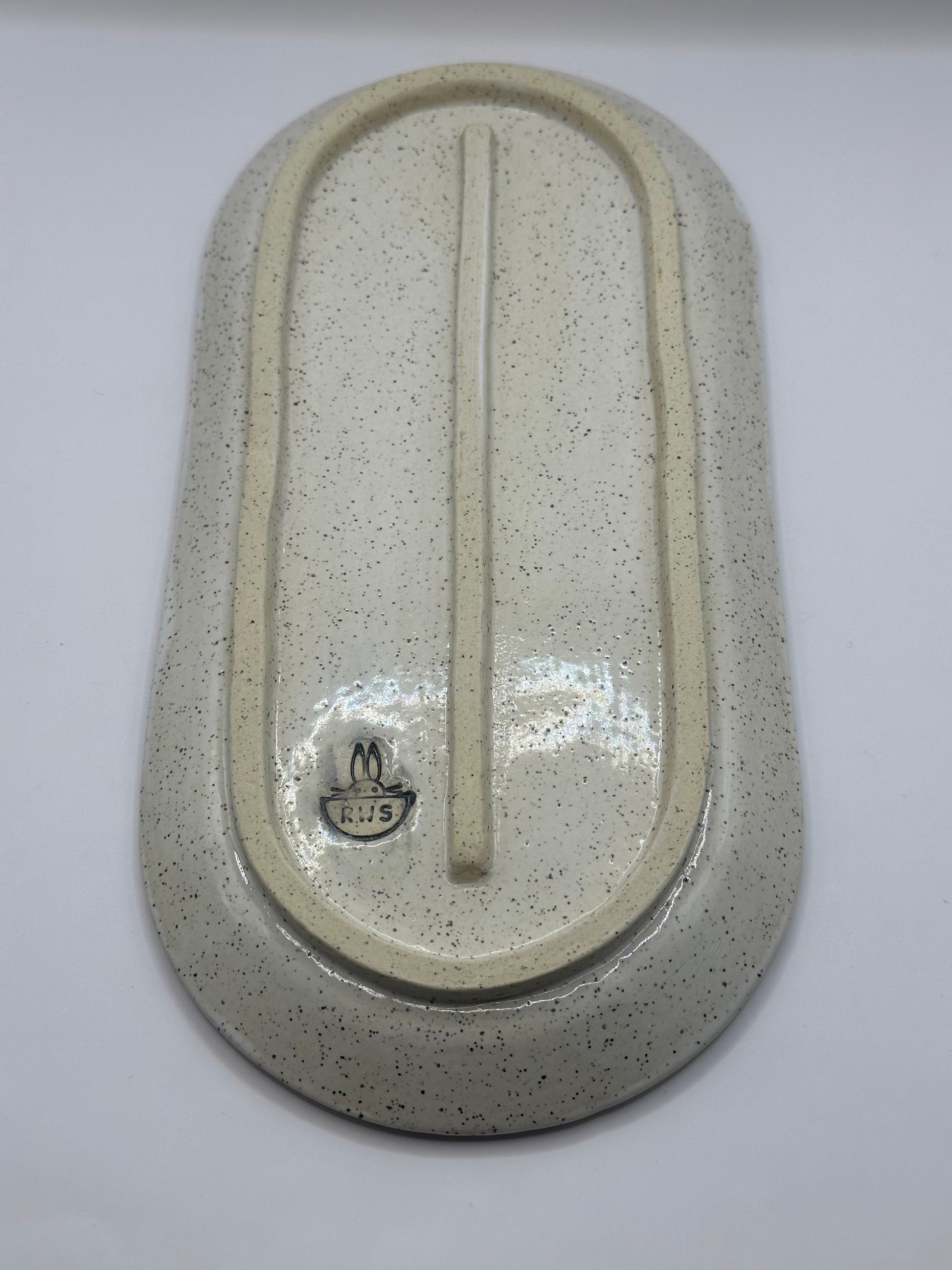 Hand built ceramic oblong dish with footed bottom